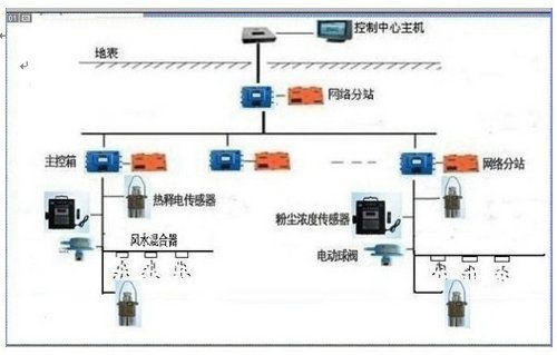 粉塵濃度在線監(jiān)測及智能噴霧降塵系統(tǒng)由礦井安全監(jiān)測系統(tǒng)、粉塵濃度傳感器、噴霧裝置主控箱、熱釋電傳感器、電動球閥、水幕組成。